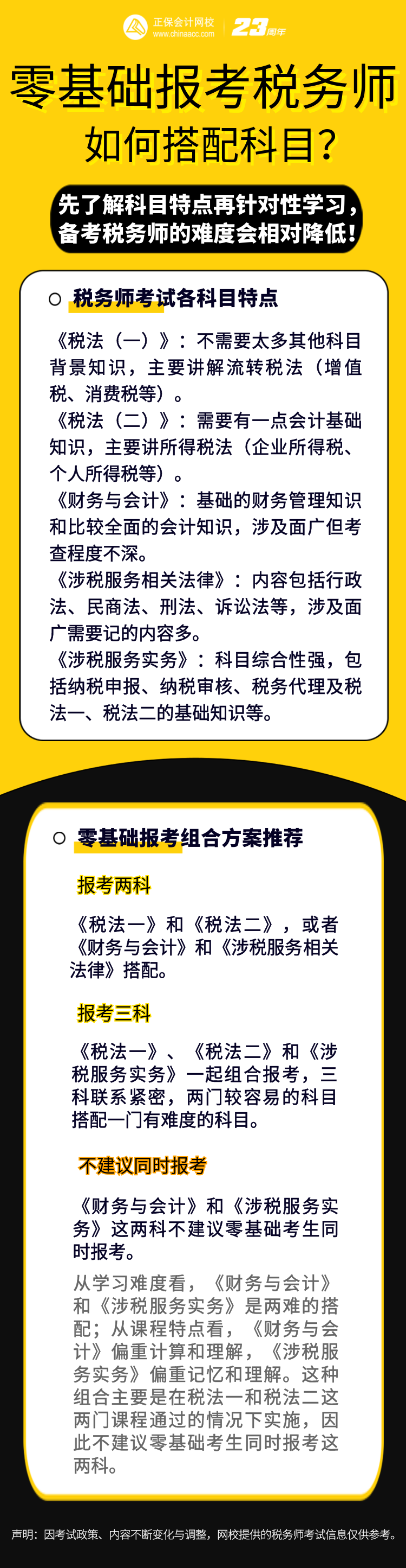 税务师考试门槛不高,所以有一些同学是零基础考生,这类人群报考税务师,那应该如何搭配科目呢?下面是一些推荐方案,大家快来看看吧!
