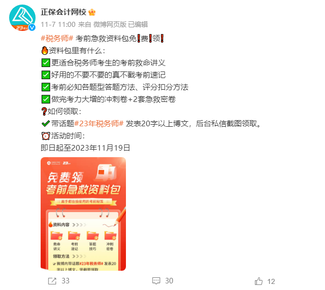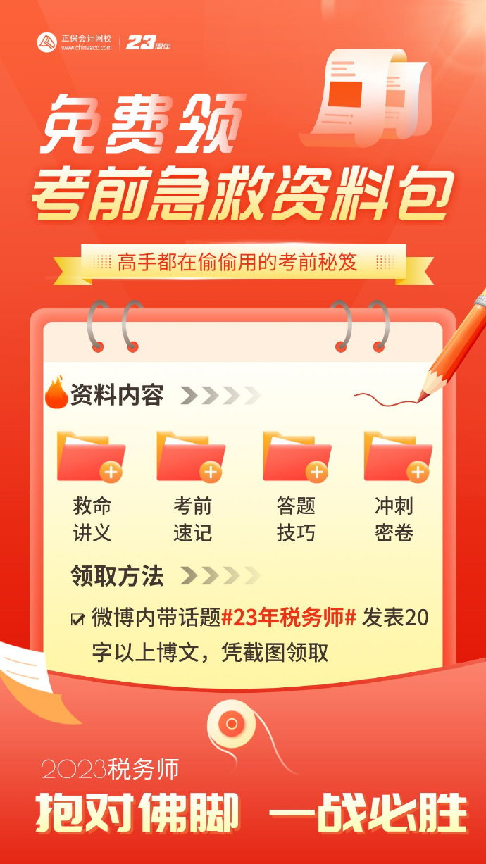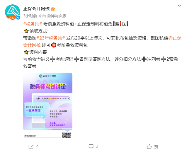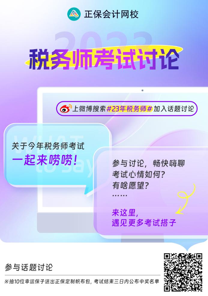 微博内带话题#23年税务师#发表20字以上博文,将博文截图私信发给@正保会计网校领取。
