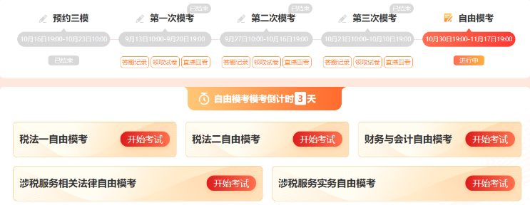 2023年税务师万人模考大赛是正保会计网校在考前推出的福利活动,依托全仿真无纸化模拟系统,为各位学员尽可能真实还原考场环境。现处于自由模考阶段,可以无限次练习,客观题自动评分,交卷即可查看成绩及解析。