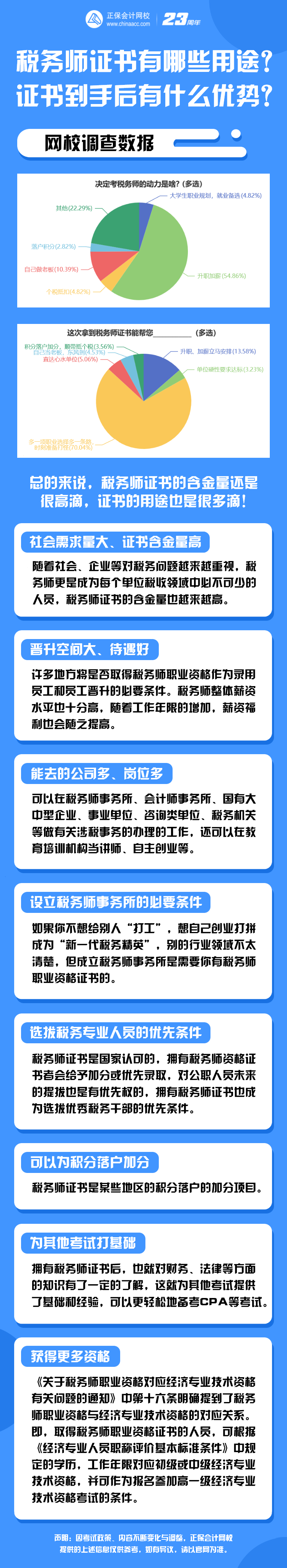 拥有税务师证书的好处真的挺多的,暂时没有税务师证书的同学可以看看有没有哪一点打动了你,已经拿到税务师证书的同学可以看看哪一处优势还没利用上,可千万别浪费了证书的价值!
