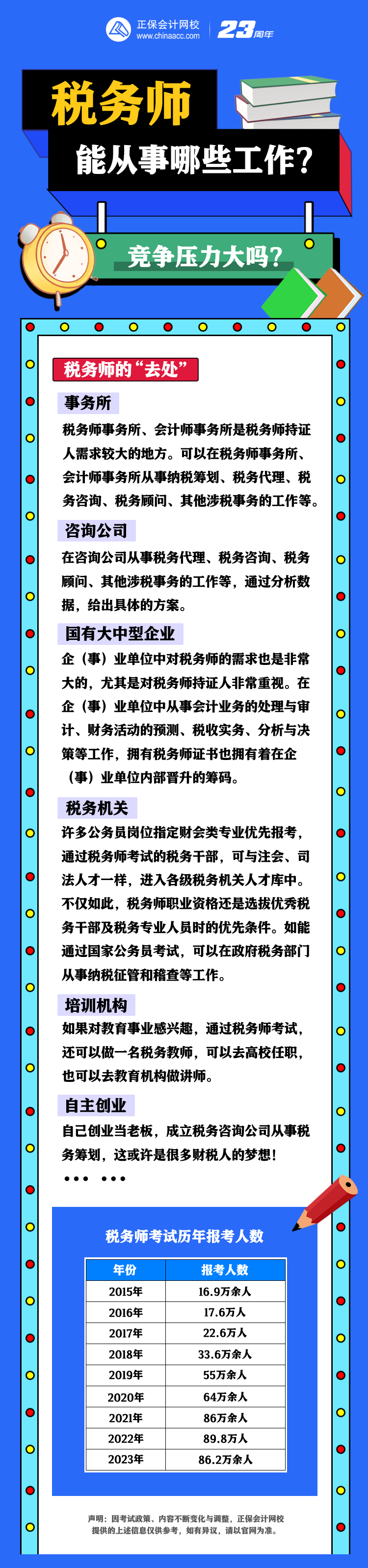 竞争压力大,主要是由于“僧多粥少”导致的,现在税务师行业还属于“僧不多”的情况,所以竞争压力还没那么大,如果想要分到“粥”,那就赶快趁着“僧少”拿下税务师证书,尽快择业、就业!