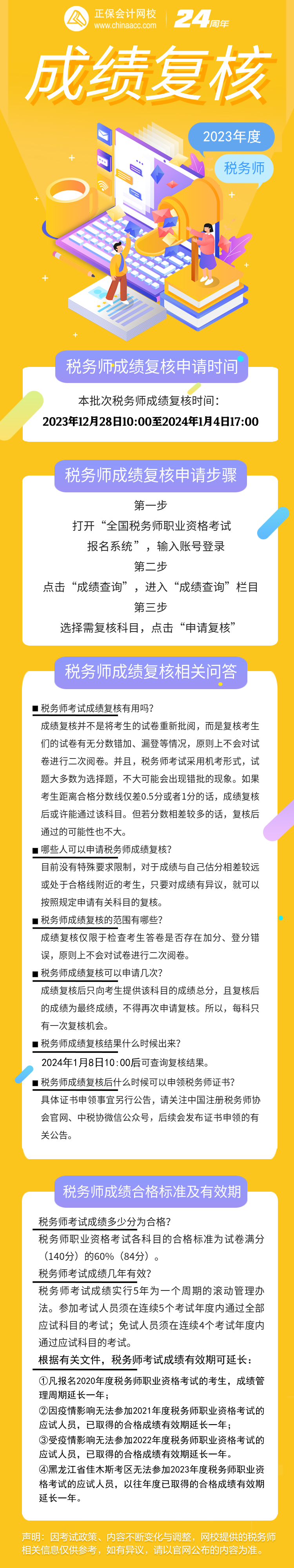 再次提醒大家,本批次税务师成绩复核时间为2023年12月28日10:00至2024年1月4日17:00,请在规定时间内申请复核!2024年1月8日10:00后可查询复核结果,祝大家好运!