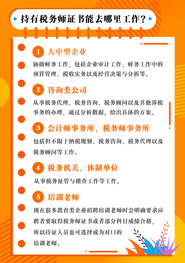 很多同学税务师都是为了升职加薪!那么拿到税务师证书后能去哪里工作呢?薪资会有多少呢?下面就快来了解一下吧!