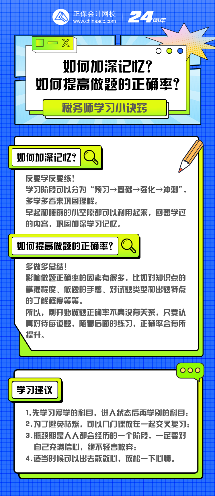备考税务师,学习很关键,要背的内容那么多,能记住很重要!那么应该如何加深记忆呢?如何提高做题的正确率?关于备考税务师的那些事儿,可是有学习诀窍滴,快来看!