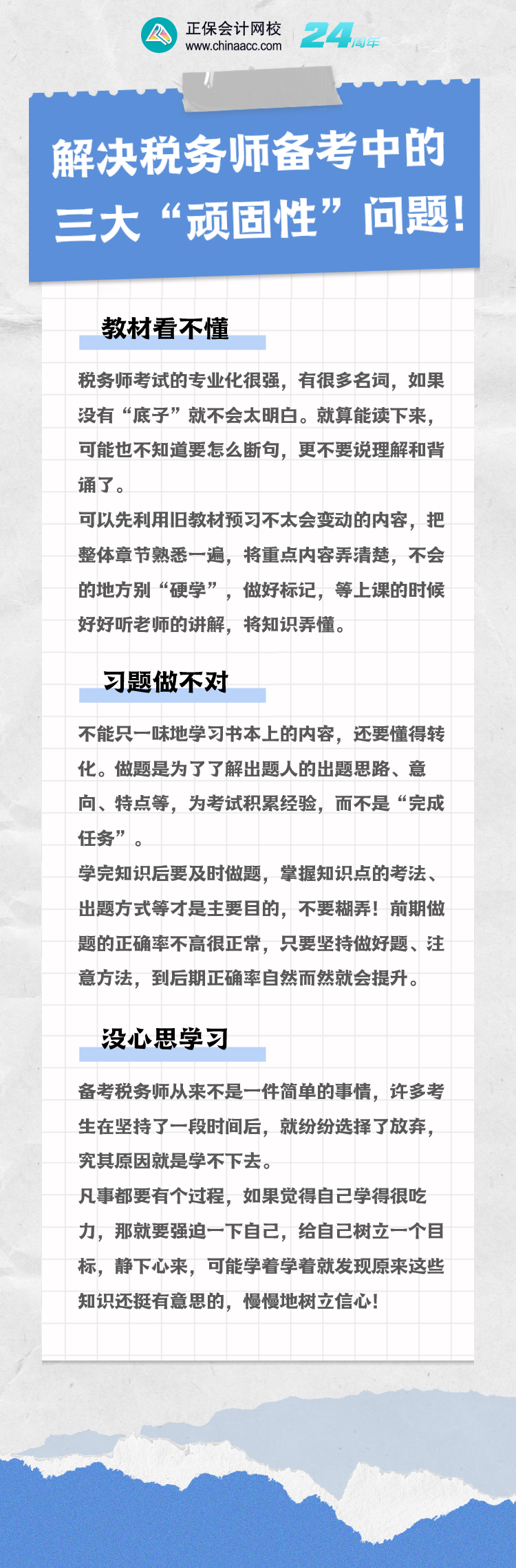 2024年税务师备考已经开始!越早准备,成功拿下税务师的几率越大,抓紧时间备考吧!学习中遇到问题不要怕,下面是同学们在备考时经常出现的三个问题,下面小编就教大家如何解决它们!
