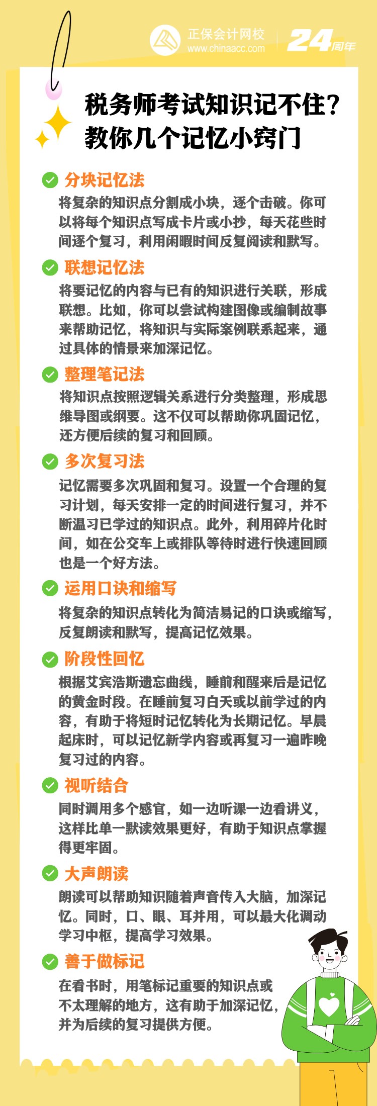 知识总是记了忘、忘了记?税务师备考需要方法,记忆知识也是。“死记硬背”是“没有办法的办法”,不建议一直使用。下面就来教大家几个记忆小窍门,帮你轻松拿捏考试重点!