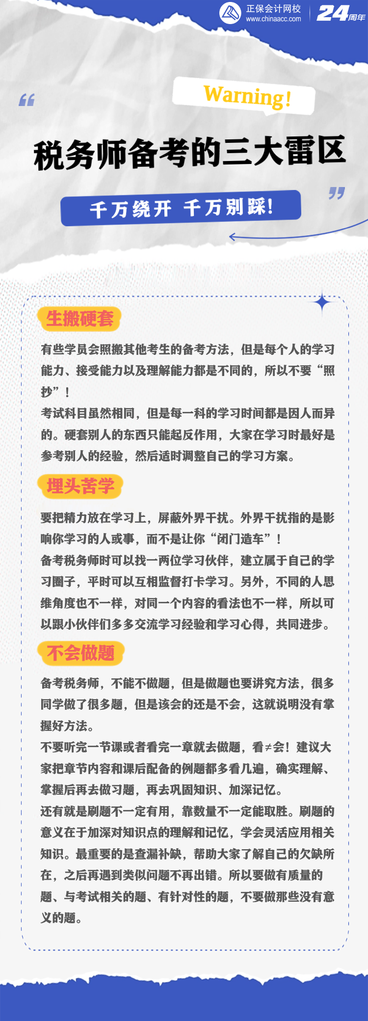 备考税务师时会遇到各种各样的问题,有些问题无伤大雅,但是有些问题会给你“致命一击”!下面来看看税务师备考的三大雷区,千万要警惕呀!