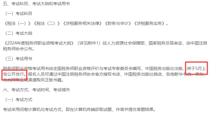 在2024年税务师考试报名公告中提到:2024年税务师考试教材将于5月上旬公开发行!