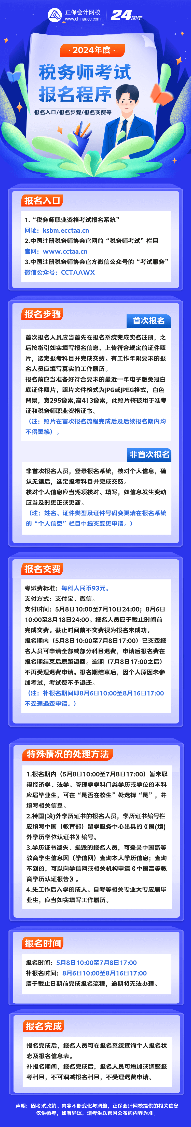 2024年税务师考试报名入口开通,打算今年考试的同学快去报名呀!为了提高报名效率,节省报名时间,大家可以在报名前先了解报名程序,先让自己心里有个谱儿~