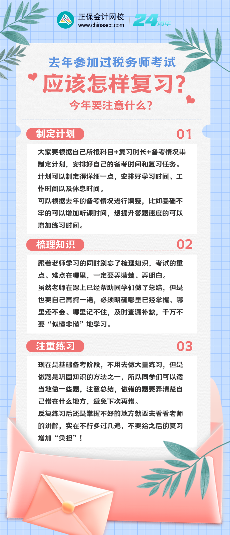如果是去年参加过税务师考试,那么大家已经有了一些经验,对于税务师的考试特点等有了了解,而且也知晓了什么学习方法比较适合自己,所以今年主要就是调整去年没有做到位的地方。