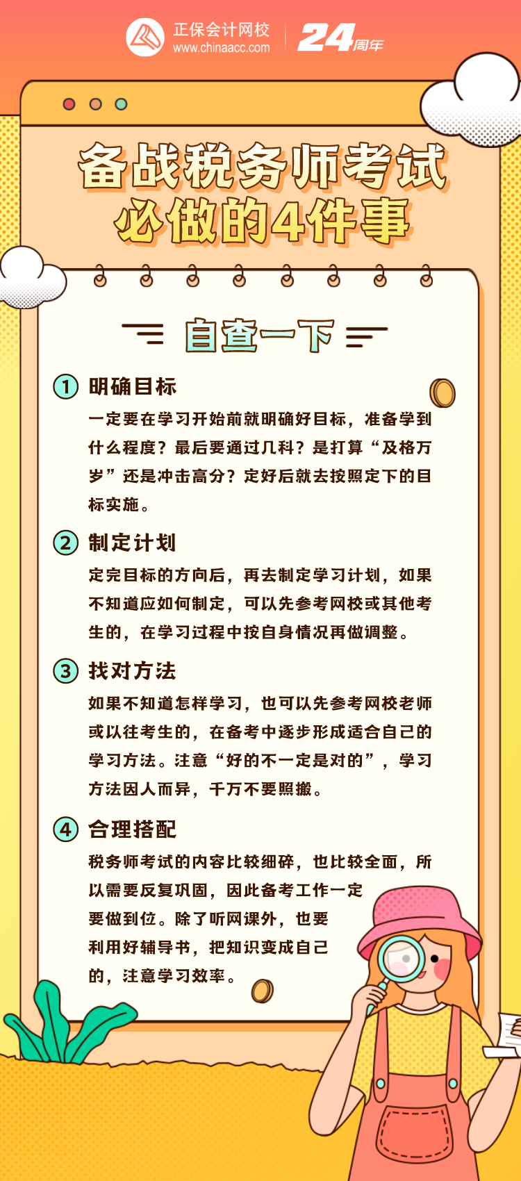 2024年税务师考试将于11月2、3日举行,想参加考试的同学现在要开始复习了!有4件事大家在备考的时候可千万别忘了,赶快来自查一下!