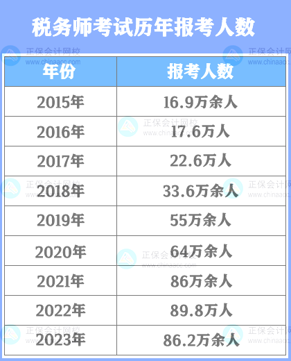 虽然税务师没有了“注册”二字,但证书的含金量可没有下降,税务师报考人数已经连续3年突破86万!