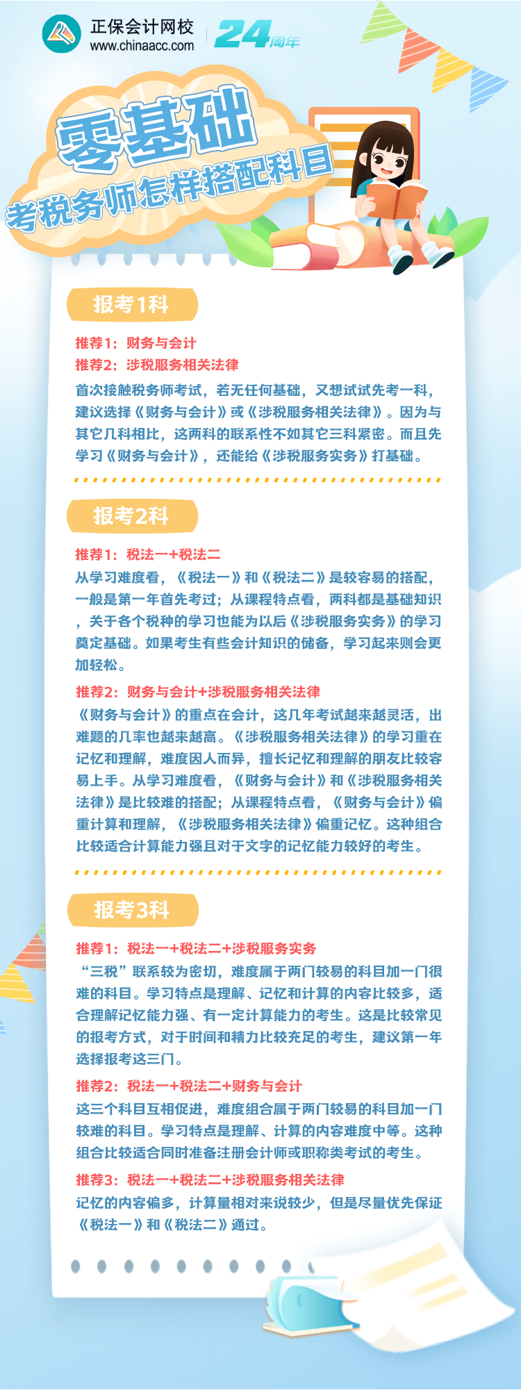 税务师考试一共有5科,不用一年全部考完,但是搭配好考试科目可以省不少力,所以零基础考生要选好考试科目,快来看看科目搭配建议吧!