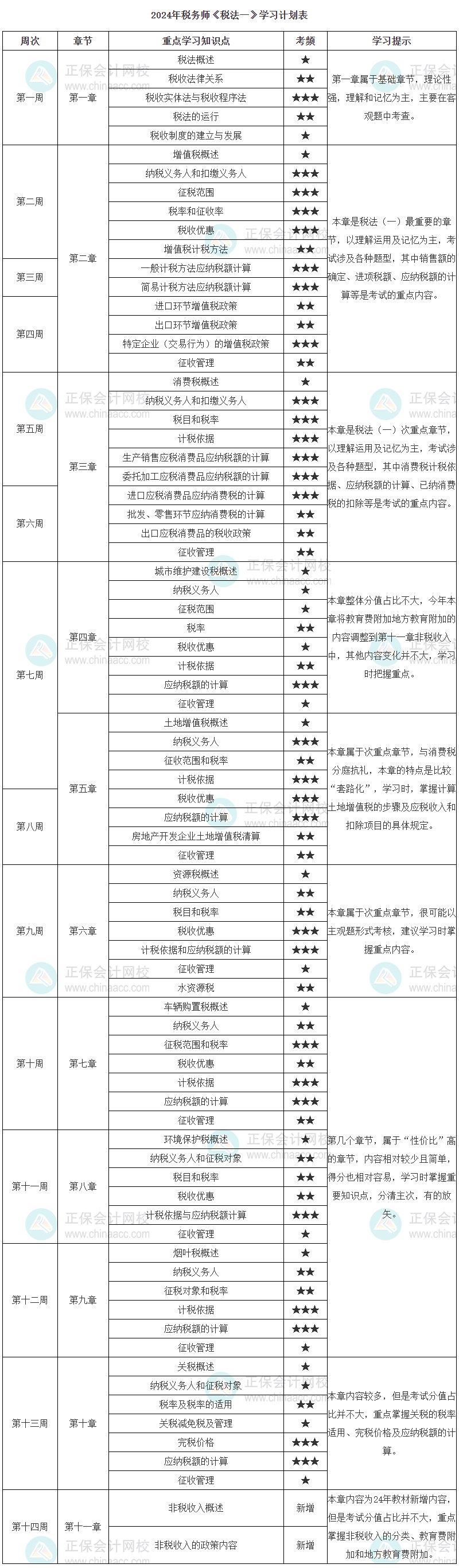 随着2024年税务师教材下发,备考正式开始!正保会计网校教研老师给各位考生整理好了2024年税务师《税法一》教材下发后的学习计划表,赶快收藏,学习有计划,备考有方向。