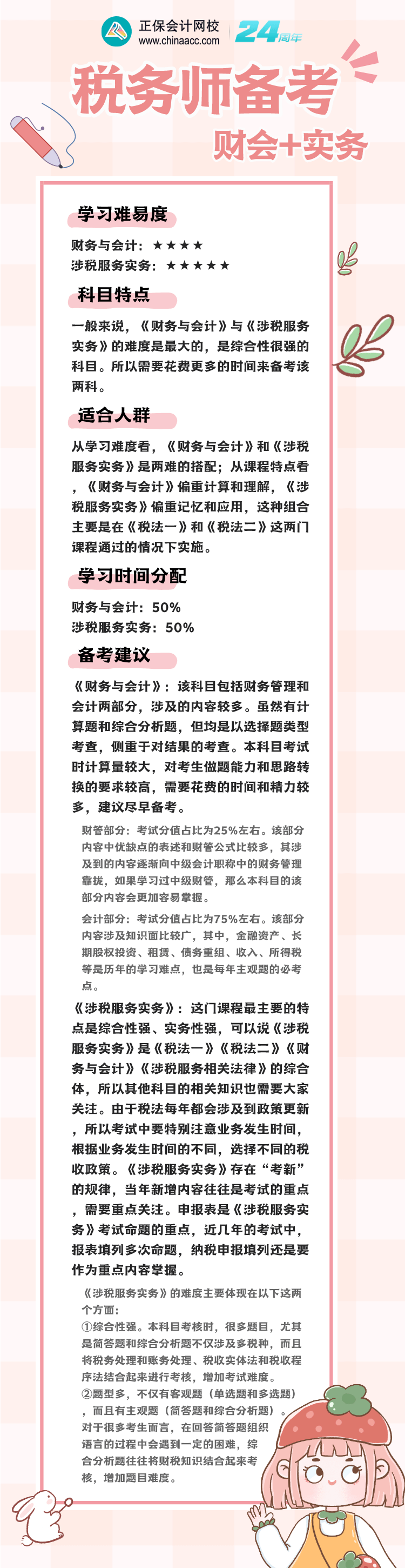 《财务与会计》和《涉税服务实务》是税务师考试中难度较高的两科,但是如果你的时间充裕且基础还不错,可以尝试把财会和实务放在一起考,这种搭配也适合刚刚考过或正在备战会计职称或注会考试的同学。