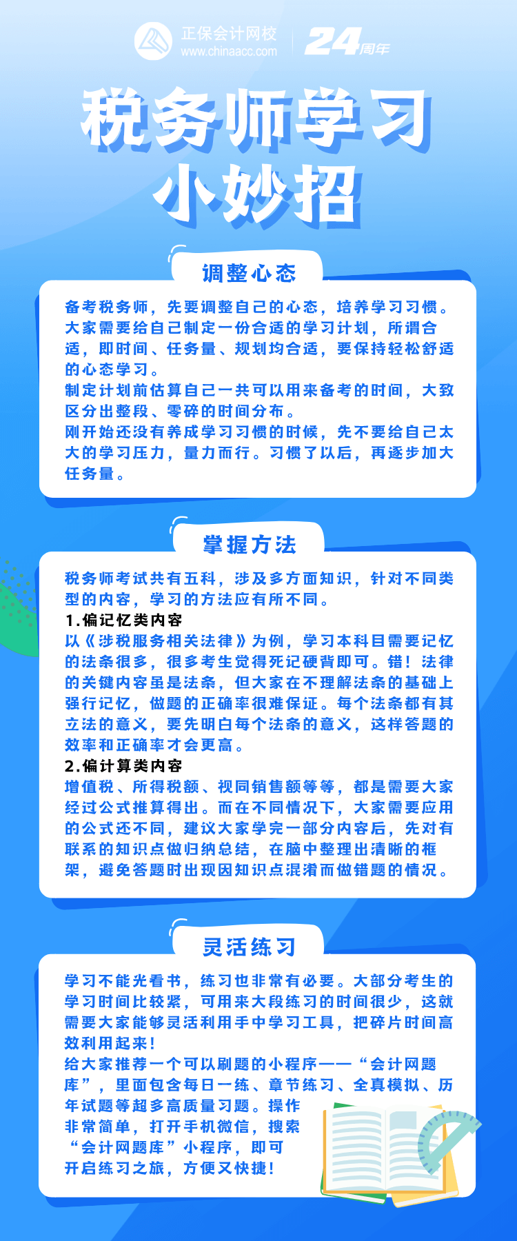 税务师考试的内容多,不好好规划的话备考压力会有些大,甚至有时候到考前都学不完!所以为了缓解大家的备考压力,提高备考效率,小编跟同学们分享3个税务师学习小妙招,助你轻松备考!