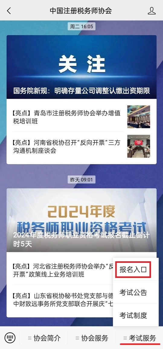 找到“中国注册税务师协会”官方微信公众号并进入,选择公众号底部菜单栏的“考试服务”,进行报名。