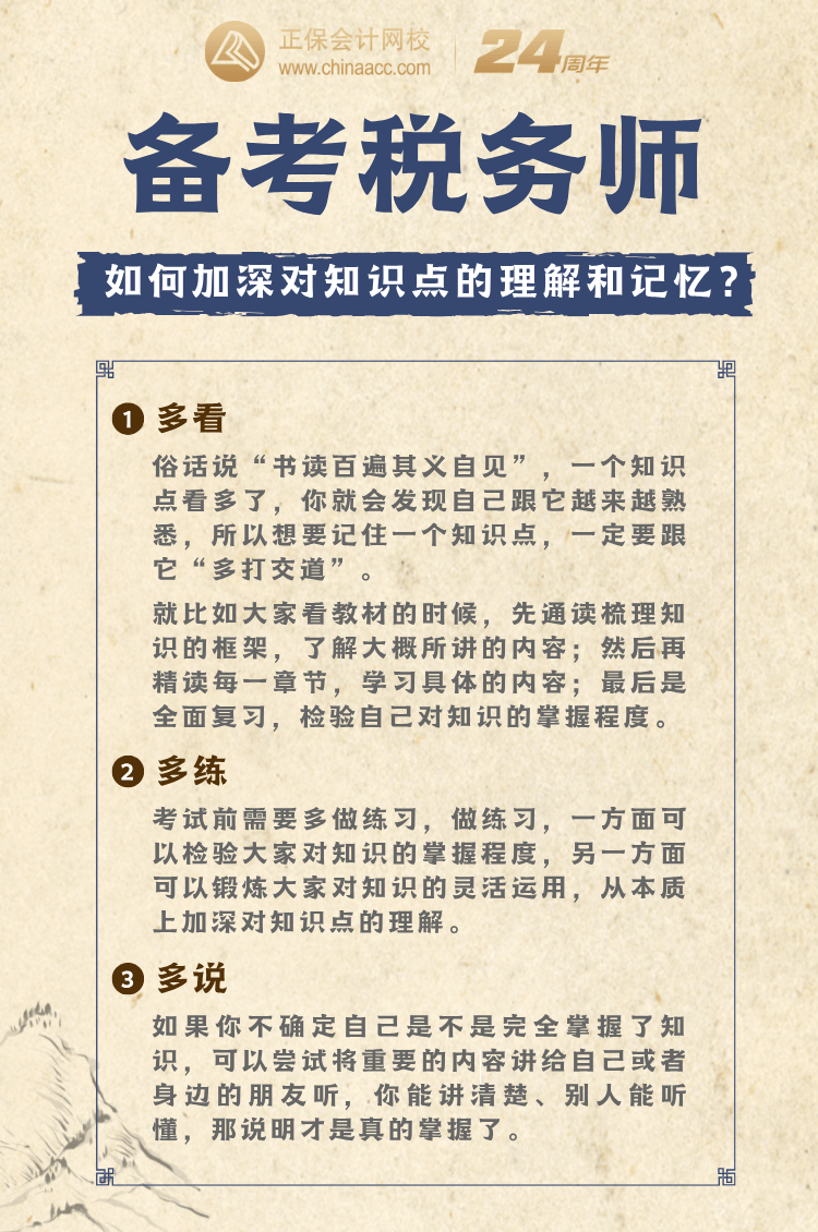 距离税务师考试的日子越来越近,大家现在学得怎么样了?税务师需要备考的内容比较多,而且很多知识都需要记忆,通常建议大家在理解的基础上记忆,那么如何才能加深对知识点的理解和记忆呢?