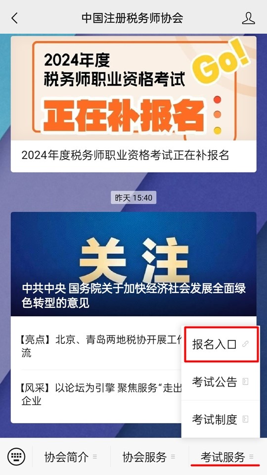 找到“中国注册税务师协会”官方微信公众号并进入,选择公众号底部菜单栏的“考试服务”,进行补报名。