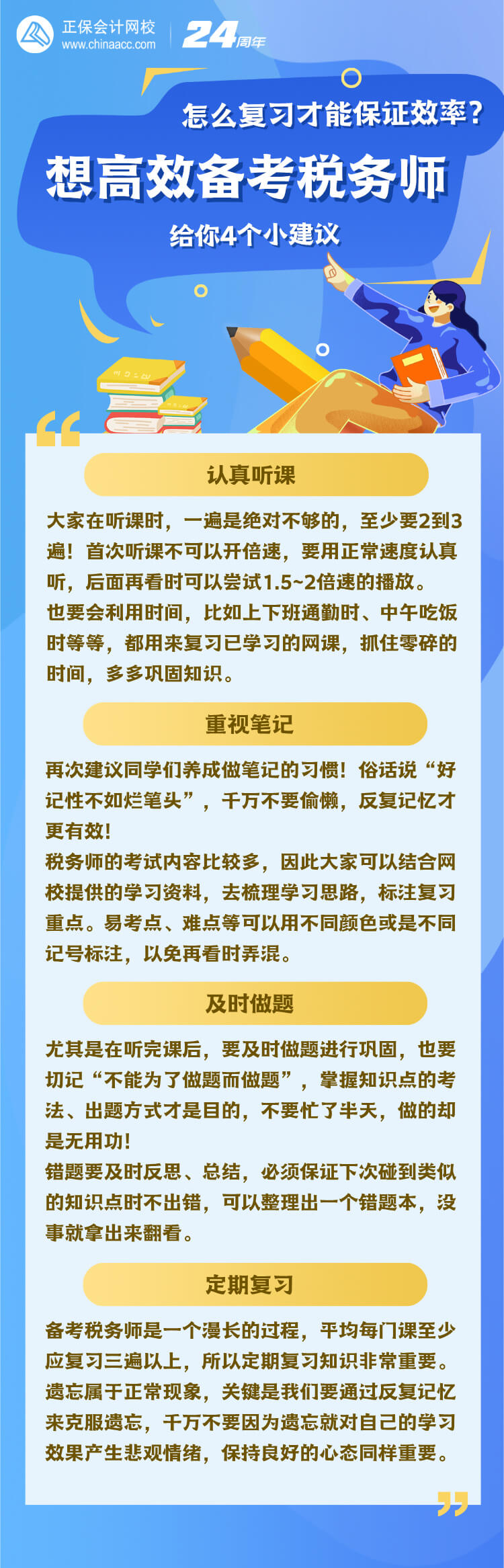 距离2024年税务师考试还剩70多天,很多同学开始着急,怎么复习才能保证效率呢?想要高效备考税务师?下面给你4个小建议。
