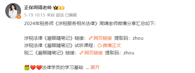 打开微博→搜索“正保周靖老师”→进入老师微博个人主页→找到置顶信息→选择想要的干货→打开网页链接,输入提取码或直接观看即可。