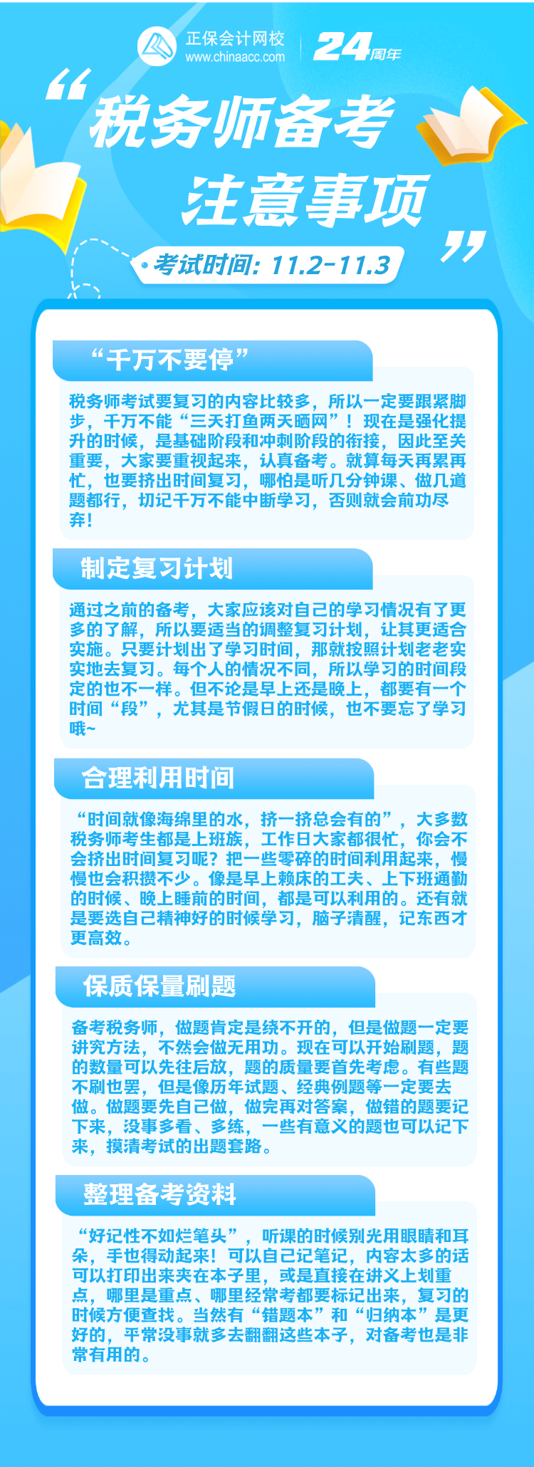 2024年税务师考试将于11月2日和3日举行(查看考试安排>>),考试越来越近,备考刻不容缓!准备参加考试的同学要继续认真学习,下面是一些备考注意事项,希望大家在复习时可以多多注意!