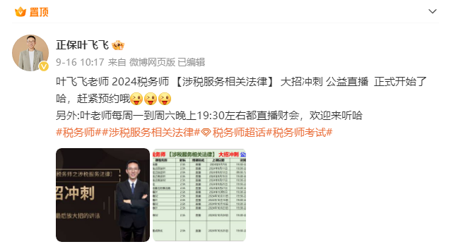 距离2024年税务师考试越来越近,正在备考《涉税服务相关法律》科目的同学,赶快来跟着叶飞飞老师冲刺吧!叶飞飞老师准备了“大招冲刺”的公益直播,赶快码住,记得按时听课哦!