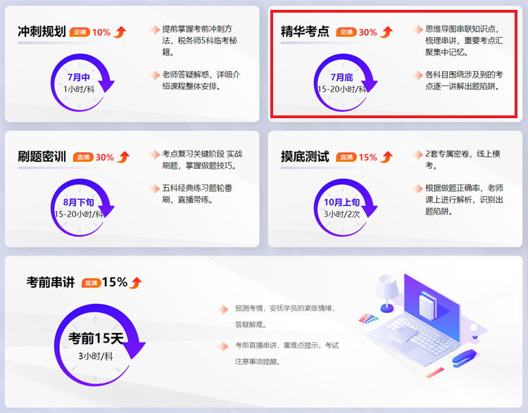 “精华考点”是税务师考前刷题密训班的一个课程阶段,各科目会围绕涉及到的考点逐一讲解出题陷阱,并用思维导图串联知识点,梳理串讲,将重要的考点汇聚,让考生集中记忆。