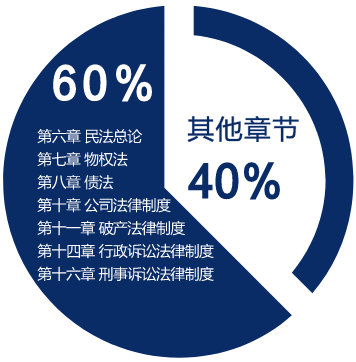 第六章 民法总论;第七章 物权法;第八章 债法;第十章 公司法律制度;第十一章 破产法律制度;第十四章 行政诉讼法律制度;第十六章 刑事诉讼法律制度分值占比: