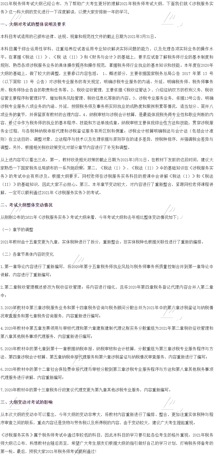 从上述内容可以看出三点:第一,教材收录相关政策的截止日期为2021年3月31日。在教材下发前的这段时间,建议大家熟悉一下国家税务总局颁布的一系列新政策;第二,《税法(I)》、《税法(II)》中的基础知识在《涉税服务实务》的考试中会有所涉及。根据大纲要求,网校老师在涉税服务实务科目的授课中会讲解《税法(I)》和《税法(II)》的基础知识,因此大家不必担心。第三,本年章节变动较大,对内容进行了重新整合,紧跟网校老师课程讲解,一定可以顺利通过2021年《涉税服务实务》的考试。