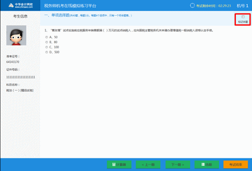 考生在答题过程中,如对当前试题选项不确定,可点击“标记”上方的选择框(下图红框处)进行标记,以方便回看该试题;用鼠标再次点击该选择框可以取消该试题标记。被标记的试题,会在选题页面中以“