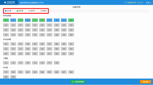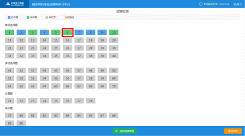 2、单击选题按钮,才可以查看本次考试科目对应题号列表页面,考生可以查看本考试科目全套试卷的作答情况,包括每道试题的已答或未答状态、标记状态,且可以点击各题号按钮,直接进入该试题进行答题或检查。