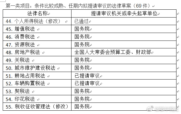据悉,十三届全国人大常委会公布了三类立法规划。其中,第一类立法项目69项,属于“条件比较成熟、任期内拟提请审议”的立法项目。几项和税收相关的立法规划全部属于此类条件已比较成熟、任期内拟提请审议的法律草案。结合此前“在2020年前全面落实税收法定原则”的要求,剩余尚未立法的税种,在此次立法规划中都有所体现。