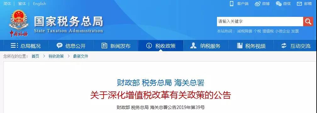 为贯彻落实党中央、国务院决策部署,推进增值税实质性减税,现将2019年增值税改革有关事项公告如下: