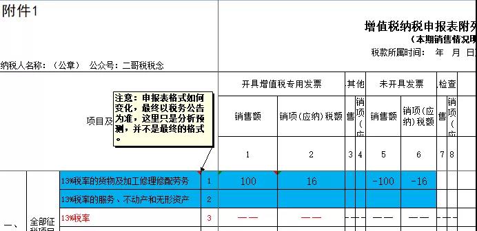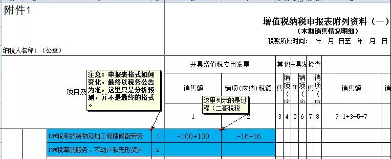供应商申报的时候也很简单,注意,下图的申报表格式是预测,最终以税务公告为准,这里只是为了演示4月1日后开具红字发票后的申报填法。