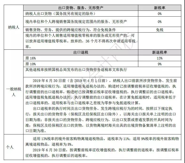 三、原适用16%税率且出口退税率为16%的出口货物劳务,出口退税率调整为13%;原适用10%税率且出口退税率为10%的出口货物、跨境应税行为,出口退税率调整为9%。