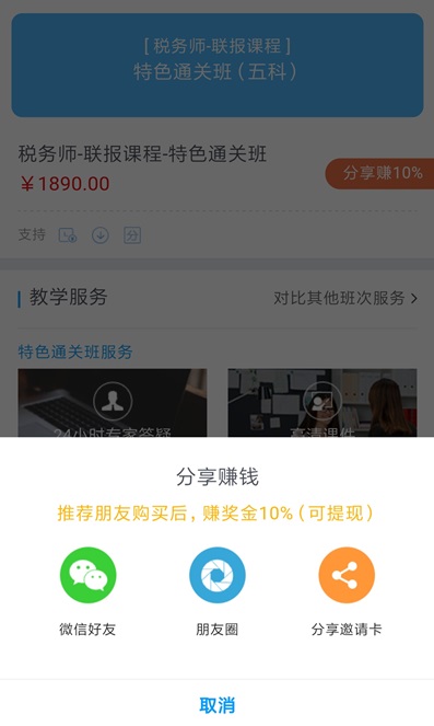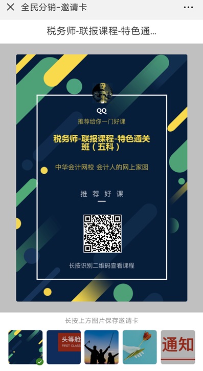 目前全民分销适配了网校大部分课程,包括初级会计职称、中级会计职称、高级会计师、注册会计师、税务师等,只要身边的朋友有需求,都可以将课程分享出去,分享购课的邀请越多,获得的收益就越丰厚。