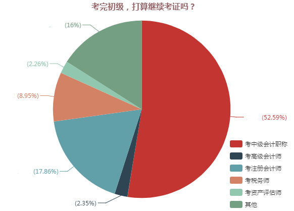 2018年中级会计职称正式报名人数已经突破135万,并且在初级会计职称考试报考门槛降低后,未来中级的潜在报考人数将会持续增加。这点从2018年初级会计职称考试成绩公布后,正保会计网校进行的调查中即可见端倪。在所有受邀调查的群体中,有将近52.59%的考生表示会继续考取中级会计职称,若以初级400万考生人数估算,就是近200多万的考生群体,中级的备考压力可想而知。而继续转战税务师考试的人数比例为8.95%,压力要小很多。