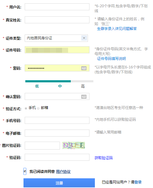 3.注册成功后,“用户名”、“姓名”、“证件类型”、“证件号码”不能修改,请认真填写,并和本人相符。该信息将引用到报名信息中,手机和邮箱将作为报考人员接收相关考试信息的工具,请务必保证身份证号、姓名、手机和邮箱信息完整、准确。