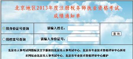 北京地区2013年度注册税务师执业资格考试成绩通知单(含合格标准)开始查询,点击下图进入查询页面。