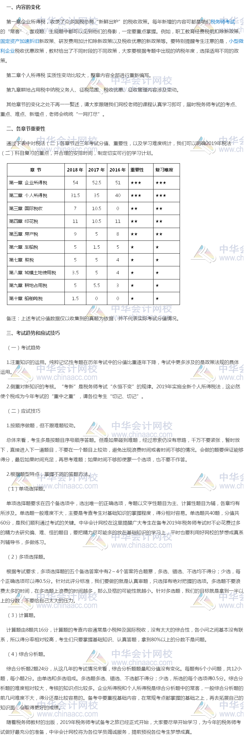 税务师税法二教材变化比较大的章节,主要是第一章企业所得税,收录了众多国税总局“新鲜出炉”的税收政策;第二章个人所得税实质性变动比较大,整章内容进行了重新编写;第九章耕地占用税纳税义务人、征税范围、税收优惠等内容都有变动。