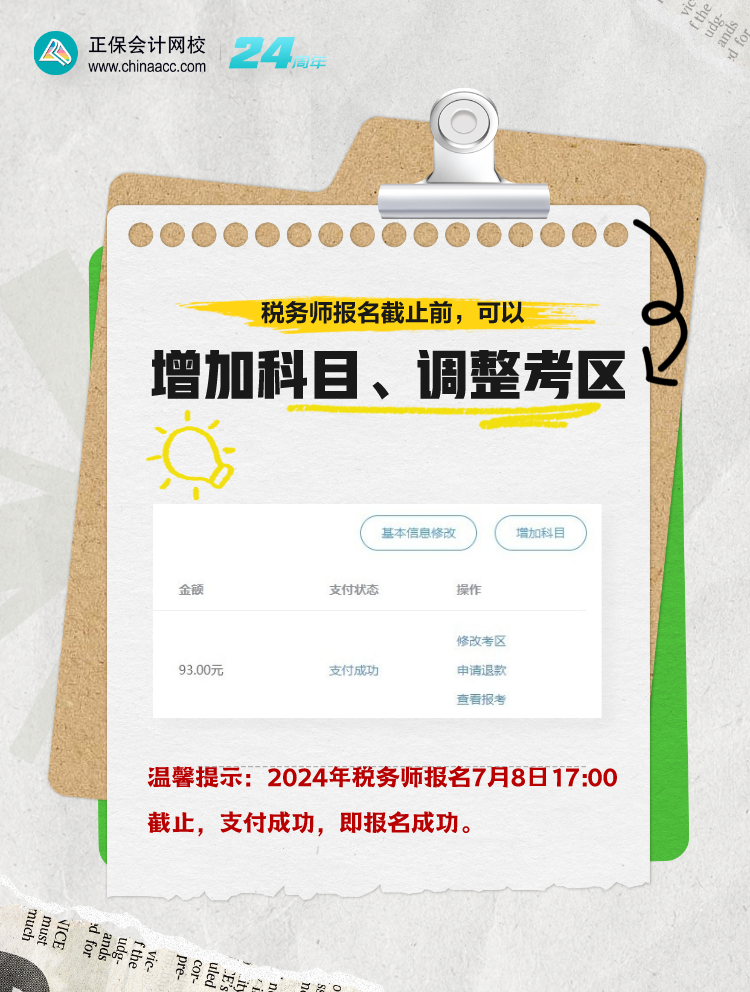 温馨提醒:2024年税务师考试报名时间截止前,可以增加科目、调整考区!2024年7月8日17:00就要关闭报名入口了,各位考生务必抽空登录一下报名系统,检查下自己是否报名成功!