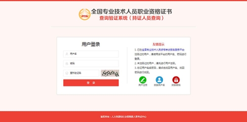 全国专业技术人员职业资格证书查询验证系统与全国专业技术人员资格考试报名服务平台共享注册信息,已在全国专业技术人员资格考试报名服务平台注册过的用户,请使用该平台的用户名、密码登录证书查询验证系统。