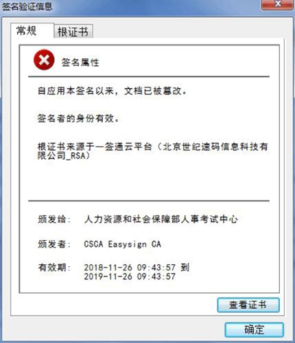 点击该电子签章,则会弹出该证书已被篡改的提示,如图。