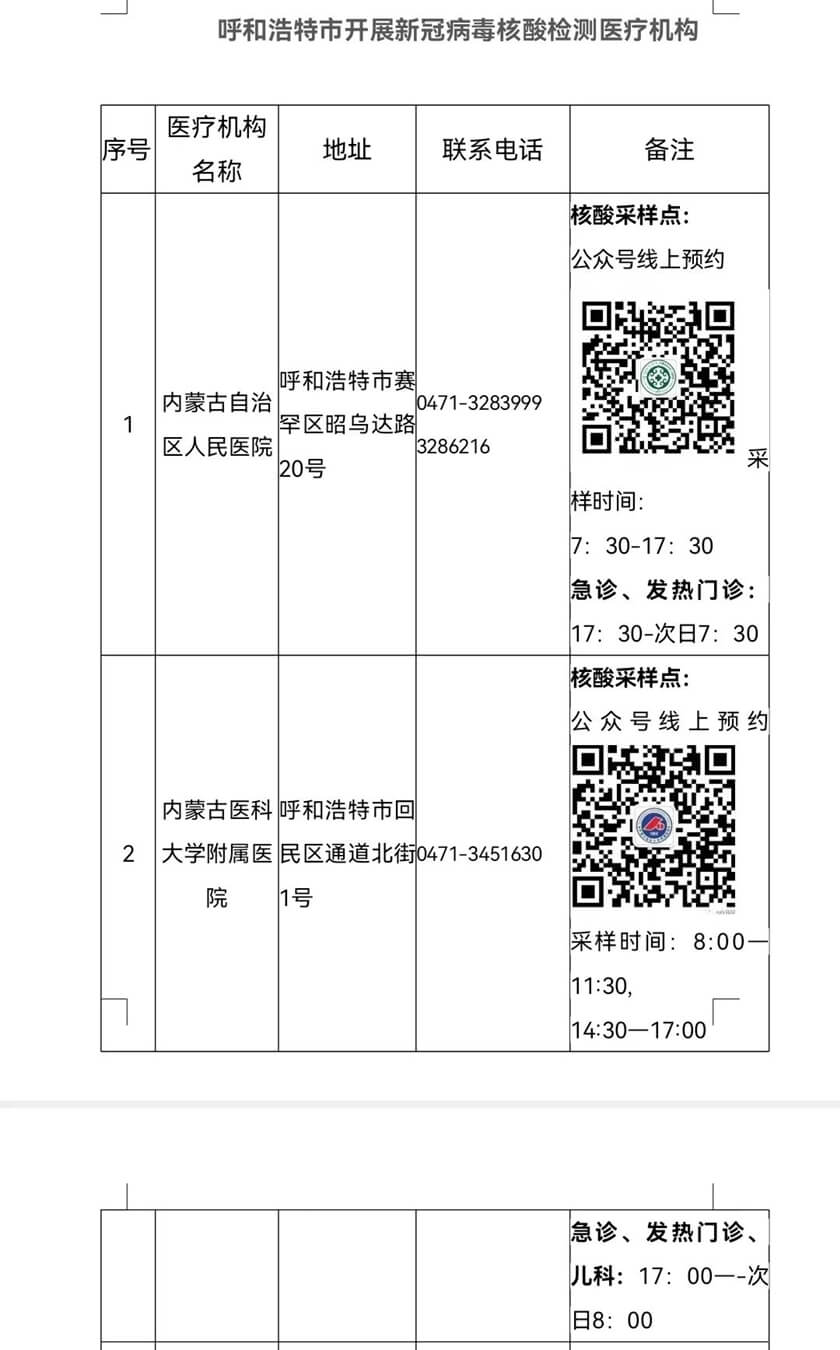 为方便广大市民出行,做好“愿检尽检”人群的核酸检测,缩短核酸检测结果报告时间,提供优质高效核酸检测服务,呼和浩特市有关医疗机构对开展新冠病毒核酸检测工作进行了新的调整,现予以公布。
