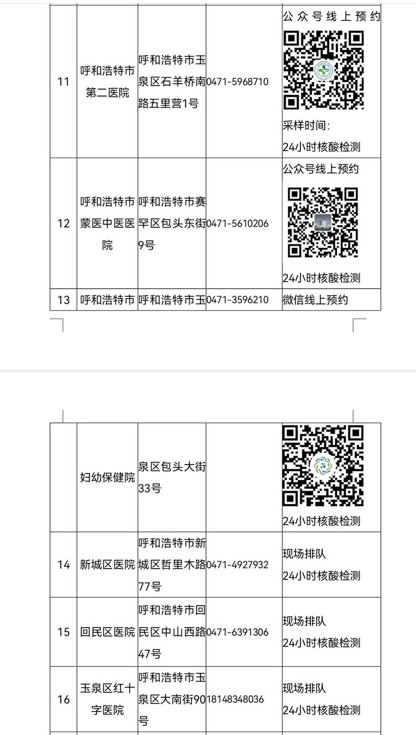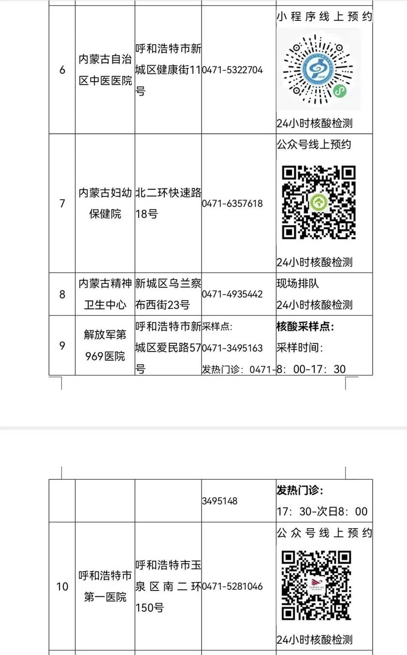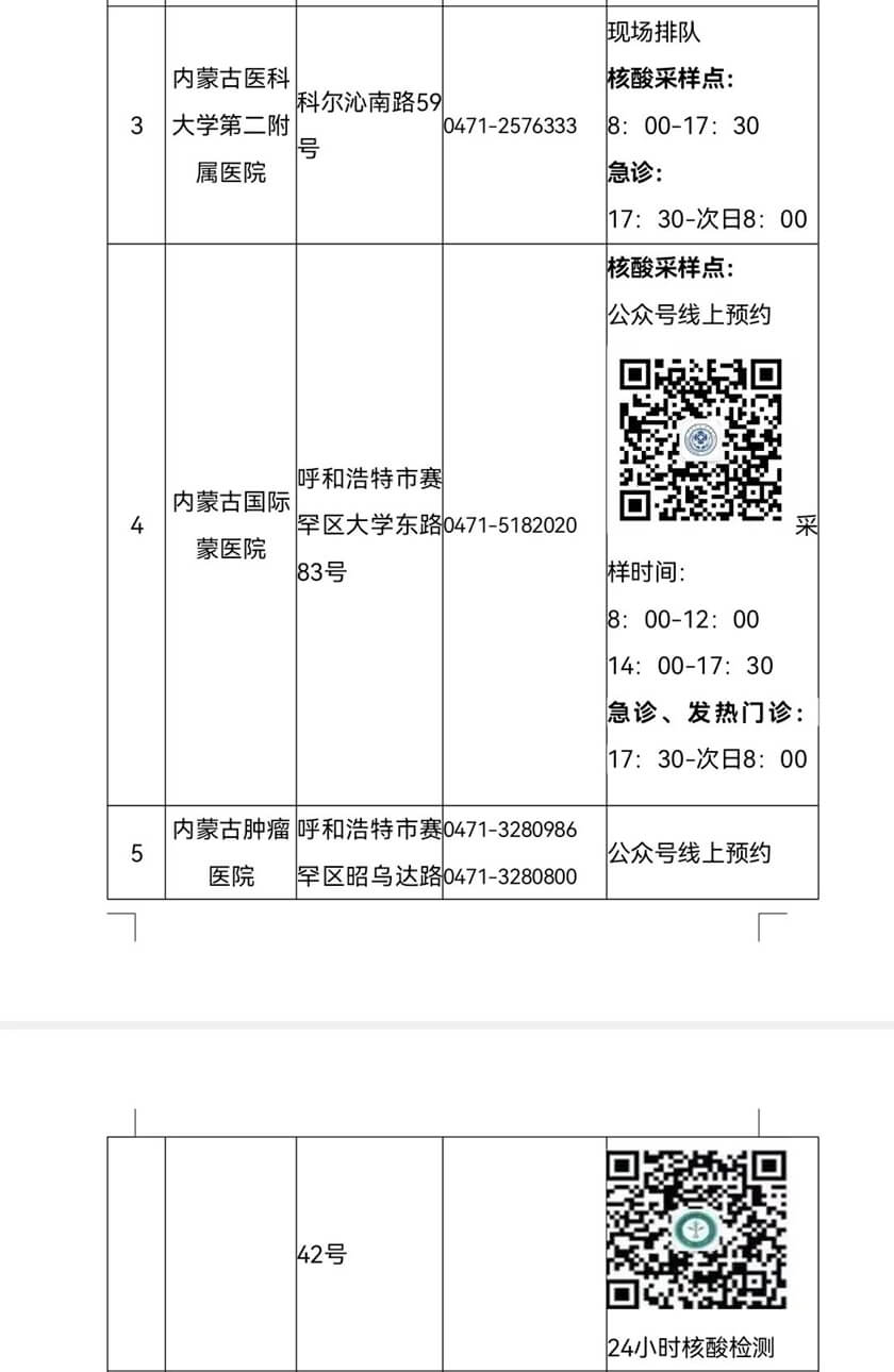 附:呼和浩特市开展新冠病毒核酸检测医疗机构