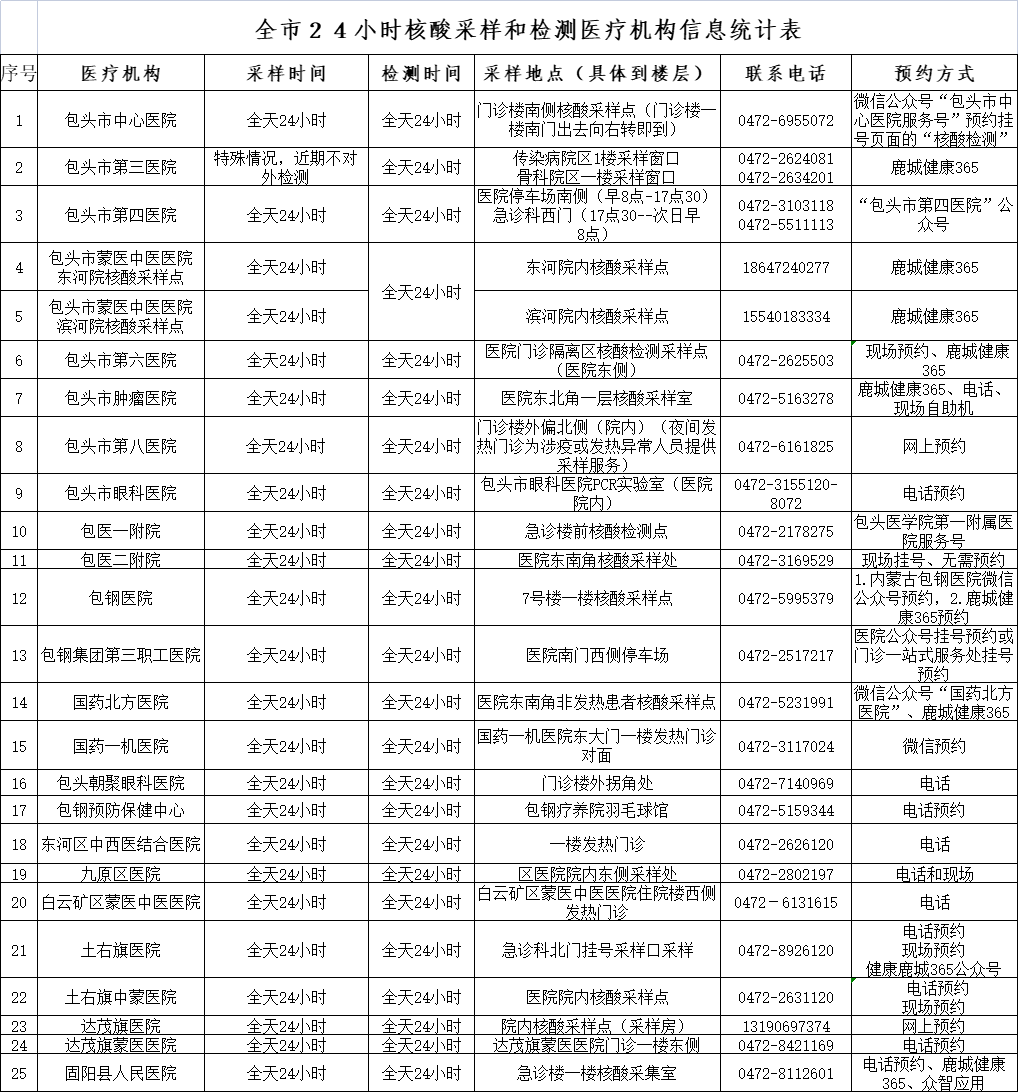 为更好的满足群众核酸检测需求,提供优质高效的核酸采样和检测服务,现将全市开展24小时核酸采样和检测服务医疗机构名单公布如下。请根据表中核酸检测预约方式提前预约核酸检测。
