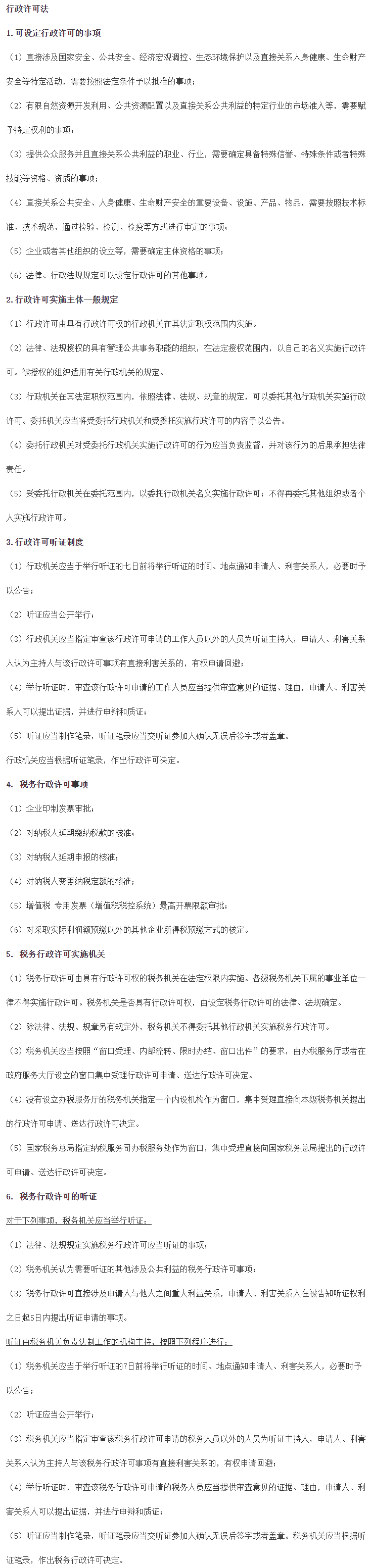 税务师《涉税服务相关法律》行政许可法的必背法条主要有可设定行政许可的事项、行政许可实施主体一般规定、行政许可听证制度、税务行政许可事项、 税务行政许可实施机关、税务行政许可的听证6个部分,所包含的必背法条具体如下: