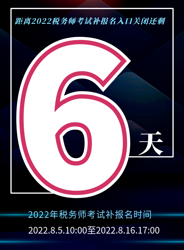 距2022年税务师考试补报名入口关闭还剩6天!想要参加2022年税务师考试的同学请抓紧时间。补报名入口>>