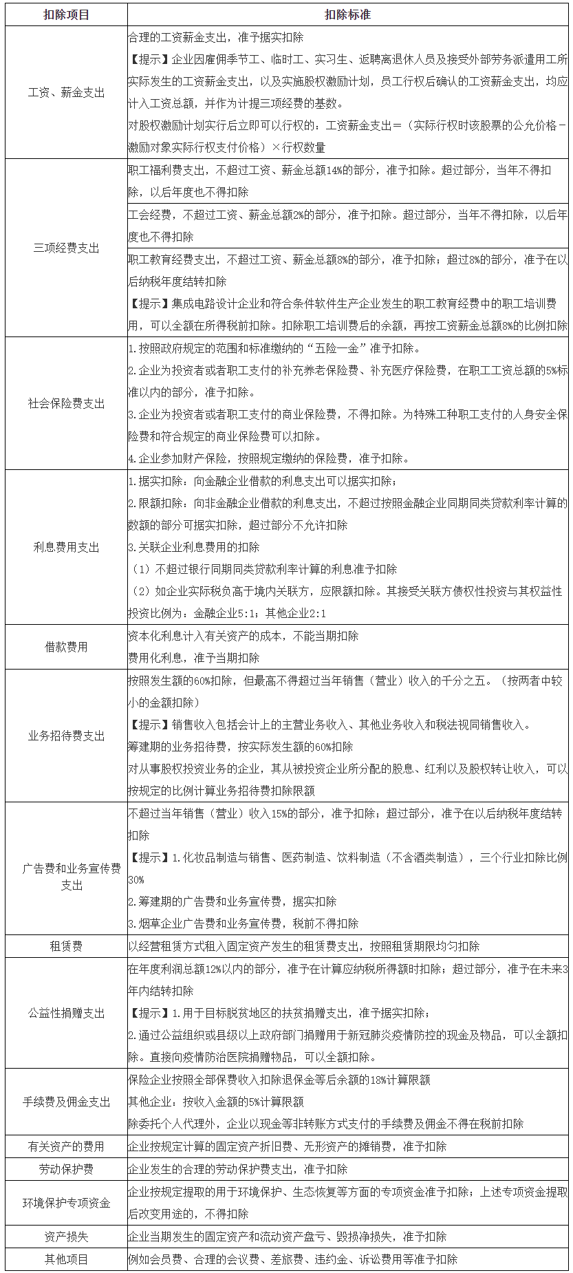 企业所得税税前扣除项目有工资、薪金支出、借款费用、租赁费、资产损失和其他项目等,相对应的具体标准如下: